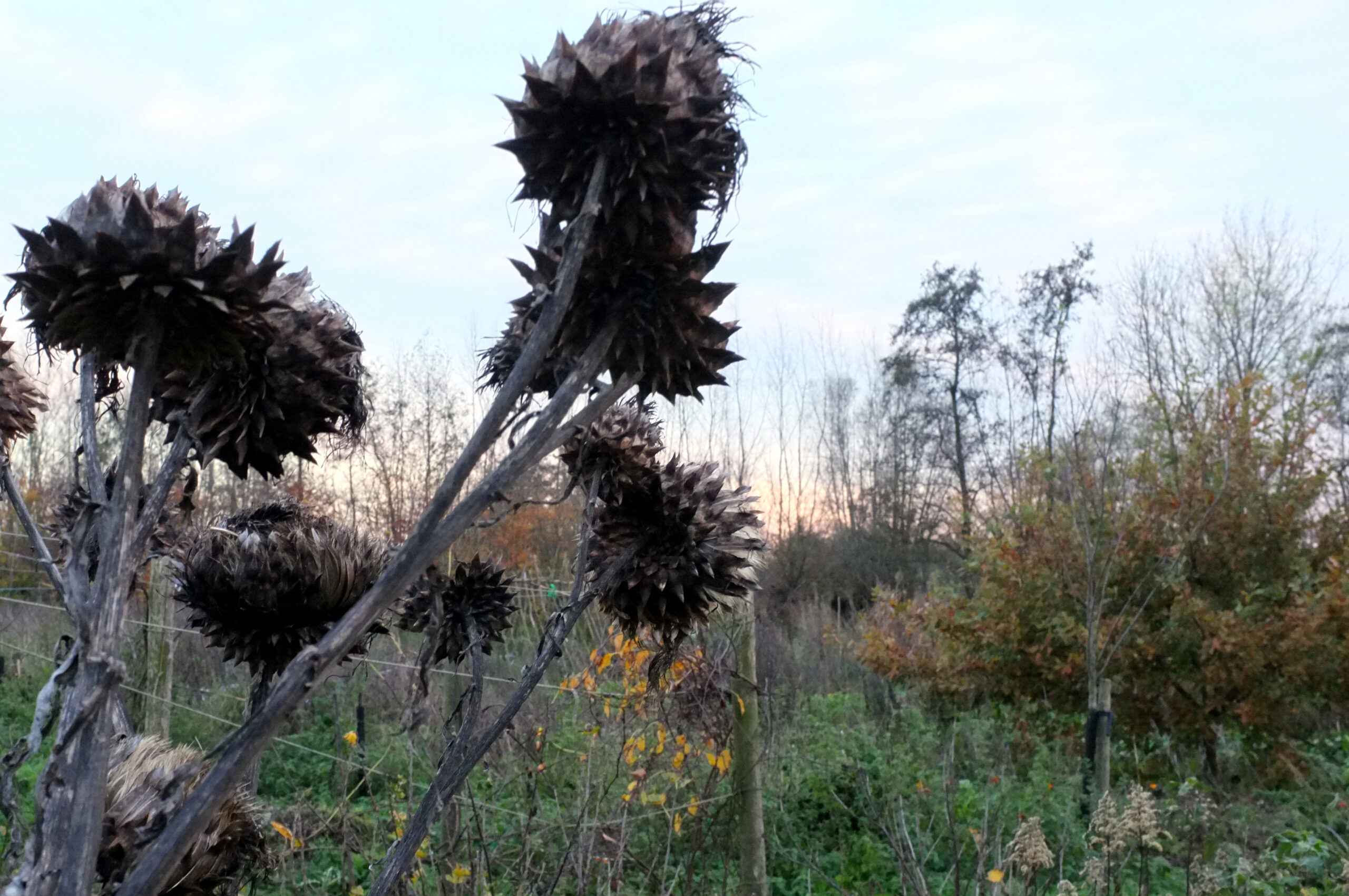 De korte decemberse werkdagen vullen we met de aanleg van een bufferstrook rond de akker. Die moet de wind breken en aanwaaiend onkruidzaad buiten houden. Een duidelijke afbakening van de akker. Een rand die zelf productief zal worden, met bessenstruiken die de toon zetten.